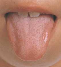 軽度の歯周病や、口腔内に虫歯などの感染症があったり、また、身体に軽度の感染症があったり、黄色い着色物を含む食事をとったり、タバコを吸う場合(一日10本以内程度)は、左のように舌の奥がうっすらと黄色くなることがあります。しかし、通常他の口腔内条件(唾液分泌量や、しっかりとした口腔内自浄作用が働いている場合は、このような状態でも特に口臭に結びつく事はないでしょう。口臭のない人にもこの程度の舌苔の人は多くいます。ただし、疲れたり口呼吸をすると口臭を起こすかもしれません。舌苔の色は、白いものは非炎症性の代謝の悪さからくるもの、黄色いものは色素の沈着をのぞくと、炎症性の舌苔が考えられます。黄色い着色物の正体については解明されていませんが、嫌気性菌が作り出す副産物や食物由来の色素ではないかと思います。東洋医学では、白い舌苔か?黄色い舌苔か?は重要な内科的診断の基準になります。成人病や、中程度以上の歯周病等の感染症が関連すると舌苔は黄色くなり、また、喫煙習慣のある人は、口臭の有無に関係なく、黄色い舌苔が付着しやすくなります。 一見、ピンク色できれいに見える舌。 口臭で悩む人は、ピンクの舌(つまり舌苔のまったくない舌)にこだわります。しかし、この、舌苔のまったく無い、一見きれいに見える舌は、実は異常な舌です。このように全体が、鮮やかなピンクの舌を持っている人も、口臭に悩まされます。舌全体が、熱っぽくなり、いつも口腔内に熱を持つようになり、すっぱい感じの口臭に悩まされます。このような、舌苔のまったくないピンク色の舌では、しばしば、ぴりぴりする感じがあったり、味覚障害を引き起こしたりします。また、老人では一般に舌表面の新陳代謝ができなくなり、舌苔がつかなくなり、ピンク色の舌になります。東洋医学では、このような舌を「紅舌」と言って、状態のよくない舌の典型の一つに分類されています。 全体に、うっすらと白い舌苔がついている状態。 正常な舌は、左の写真のように、うっすらと白い舌苔が付着しています。このように、正常な舌には、舌の回りと尖端には舌苔がなく、舌先1センチくらいから奥に行くにしたがって、薄い白い舌苔が付着しています。このように見える時は、ベストコンディションの時です。起床時や、疲れた時はこの白い舌苔の量は増加します。一日の中でも白い舌苔の量は変化しています。白い舌苔は代謝の悪さや、舌乳頭(舌表面のビロード上の構造)が長いなどの、解剖学的特徴が原因であると思われています。白い舌苔も慢性化すると、嫌気性菌が定着することになり口臭の原因になるでしょう。